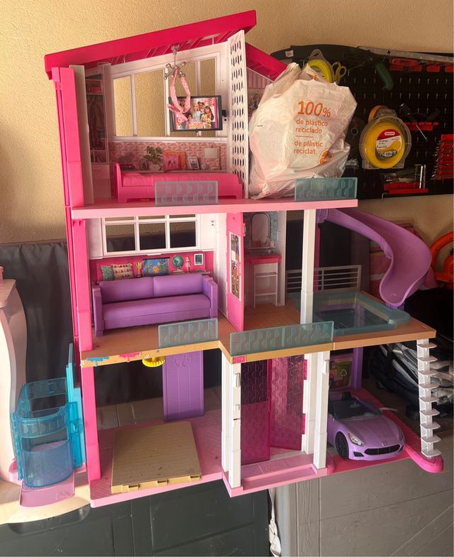 Dettagli del prodottoIn vendita casa di Barbie a più piani con accessori. - Include un'auto viola. - Dispone di scivolo e piscina. - Più stanze e dettagli. La descrizione è stata tradotta automaticamente.
