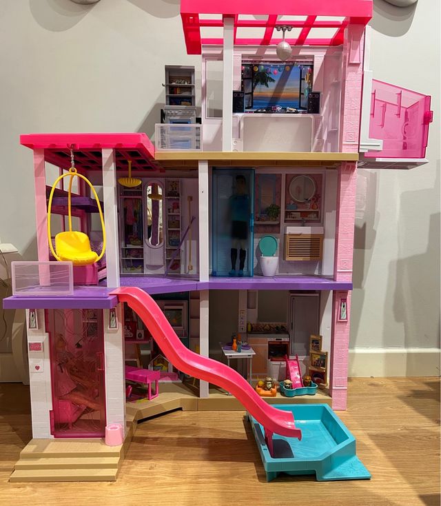 Dettagli del prodottoCasa delle bambole Barbie Dreamhouse con più livelli e accessori. Include scivolo rosa, piscina blu, altalena gialla, mobili e accessori per cucina e bagno. La descrizione è stata tradotta automaticamente.