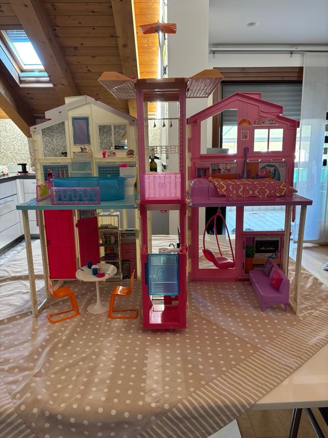 Iconica casa delle Barbie Malibu a 3 piani, perfetta per infinite avventure. - Struttura a tre livelli. - Design colorato e dettagliato. - Include ascensore funzionante.