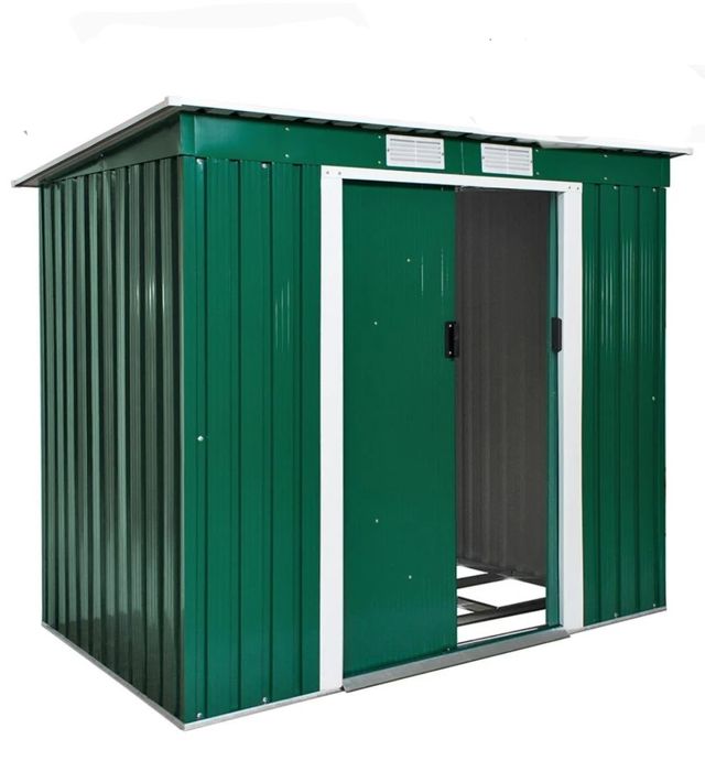 Casetta box da giardino con tetto ad una falda, realizzata in lamiera zincata e verniciata