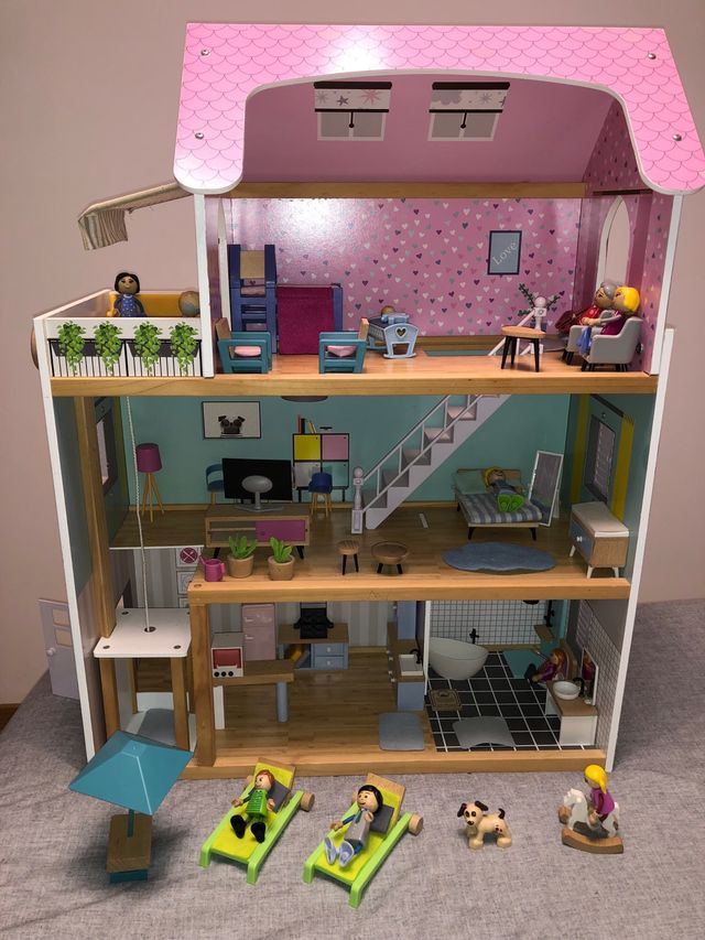Dettagli del prodottoCasa delle bambole KidKraft con accessori. Realizzata in legno. L'ascensore funziona. La porta ha il campanello. Lampade a soffitto con luce a batteria. Porte e finestre si aprono e chiudono. Dimensioni 64x31x80 cm La descrizione è stata tradotta automaticamente.
