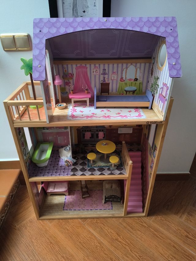 Dettagli del prodottoCasa delle bambole in legno con diversi livelli e accessori.