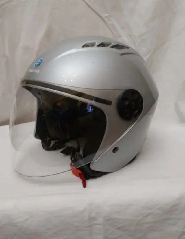 Dettagli del prodottoCasco jet Piaggio, taglia M. Colore argento, con visiera trasparente.