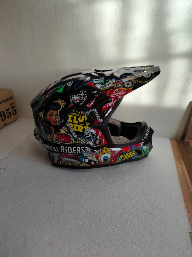 Casco O'Neal con un diseño llamativo y lleno de graficas. Nuovo mai usato - Diseño Full Face. - Estampado con múltiples dibujos y textos. - Visera superior.