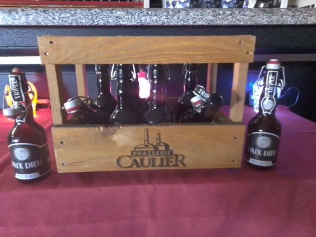 Cassetta in legno per birra della Brasserie Caulier. - Materiale: legno. - Design: stile rustico con logo inciso. Include 12 bottiglie vuote Paix Dieu