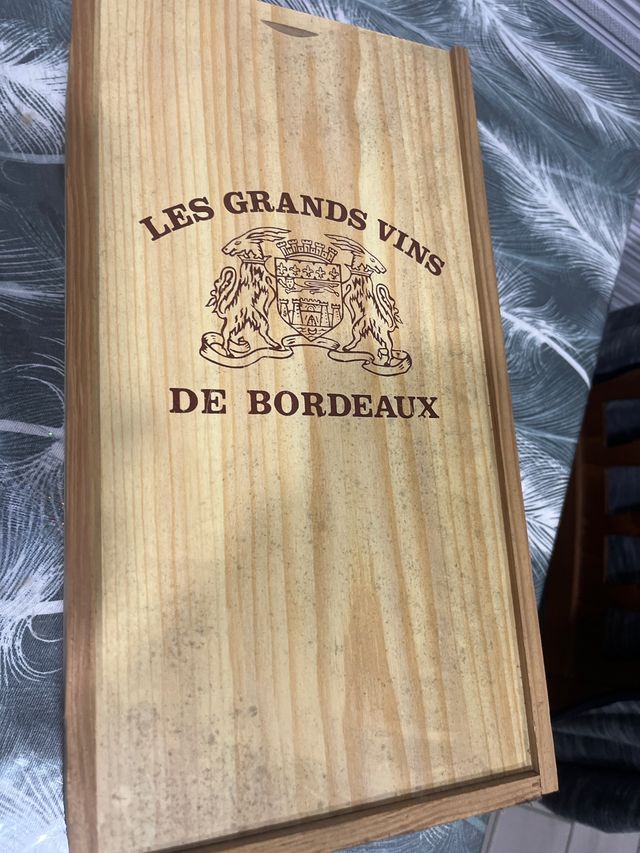 Elegante cassetta in legno per bottiglie di vino. - Decorazione Les Grands Vins de Bordeaux. - Materiale: legno.