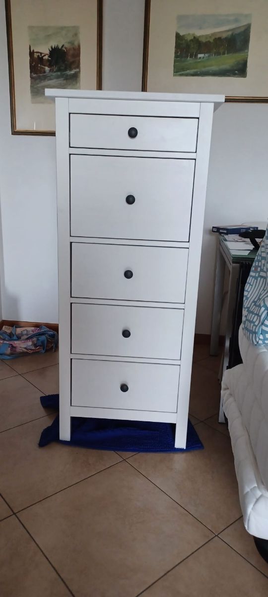 Dettagli del prodottoCassettiera Hemnes ,5 cassetti ,colore bianco ,con pomelli in ferro neri.Misura:H130xL58xP39,5cm.Per qualsiasi chiarimento o domanda ,scrivete pure in chat. Misure del prodotto