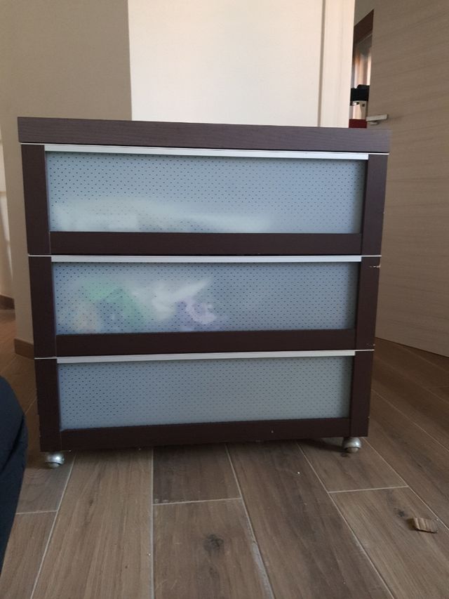 Dettagli del prodottomobile a tre cassetti, pratico e maneggevole color wengè. Il fronte dei cassetti è in vetro opaco con puntini trasparenti. Ne ho tre uguali. il prezzo è per singolo pezzo. Vendita faccia a faccia misure: L 83 H 84 P 44