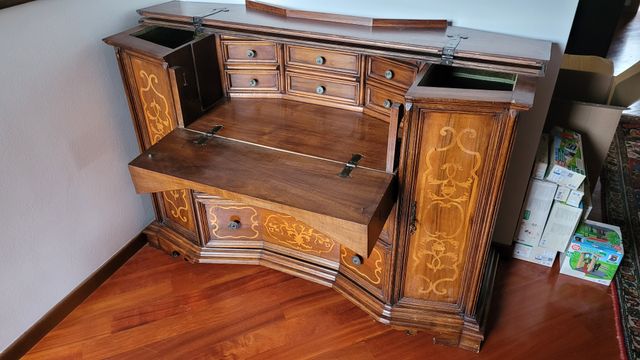 Dettagli del prodottoCassettiera del '900 con scrivania a scomparsa, intarsiata e con cassettini interni. Oggetto molto particolare e d'impatto in qualsiasi ambiente. Misure (circa): larghezza 141, altezza 94, profondità con scrivania chiusa 51 nel punto massimo, 43 nel punto minimo. Profondità con scrivania aperta 75. Visibile a Bergamo città con comodo parcheggio.