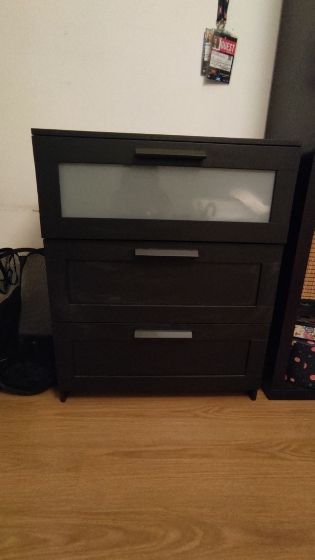 Dettagli del prodottoCassettiera nera ikea con 3 cassetti, uno con vetro. Presenta solo un graffio sulla parte superiore ma per il resto è perfetta, i cassetti scorrono benissimo e non ha altri danni.