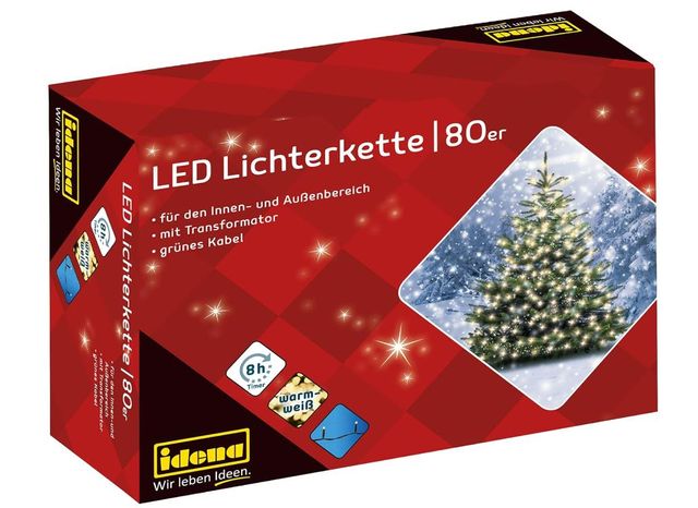 Dettagli del prodottoCatena luminosa decorativa con 80 LED di colore bianco caldo (temperatura di colore 2700k), con spina e trasformatore, lunghezza totale circa 16 m (di cui circa 8 m di cavo di alimentazione), adatta per interni ed esterni