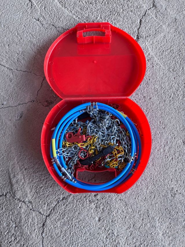 Set di catene da neve per auto, conservate nella loro custodia rossa. SMC9-70 mm9 nuove mai usate, per la misura delle ruote vedere etichetta in foto.