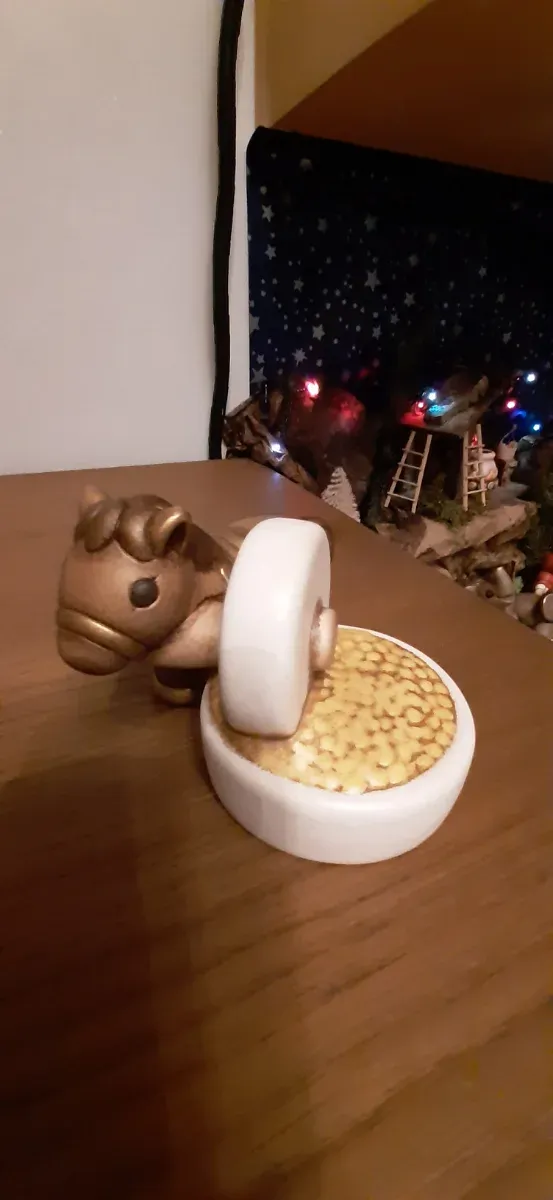 Grazioso cavallo in ceramica con macina, parte di un presepe Giubileo. - Dettagli dorati sulla macina. - Finitura lucida.