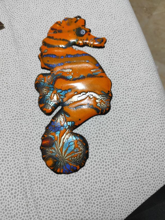 cavalluccio marino in rame smaltato interamente realizzato a mano. l'occhio del pesce è una murrina. misura 21x9