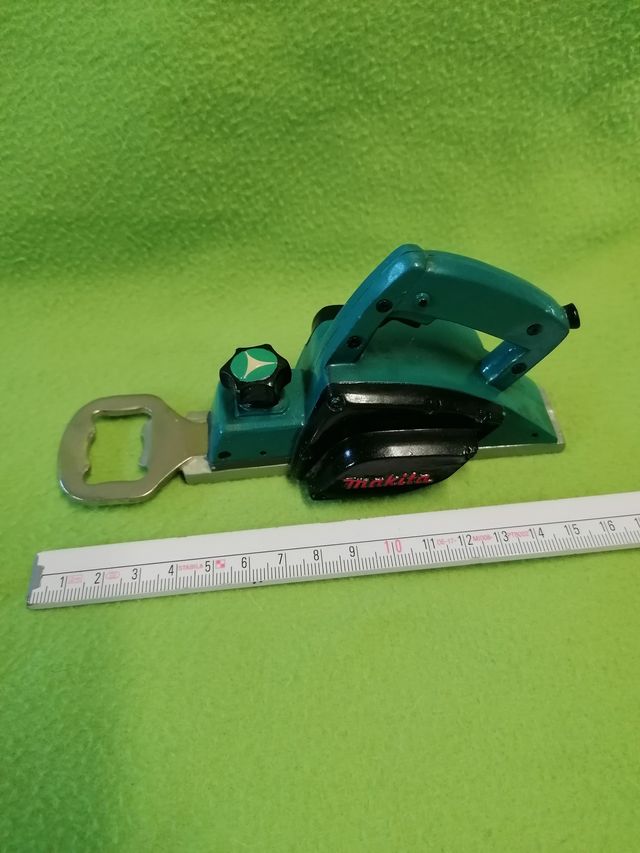 Cavatappi originale Makita, con un design unico a forma di pialla elettrica. - Colore: verde acqua e nero. - Logo Makita ben visibile.