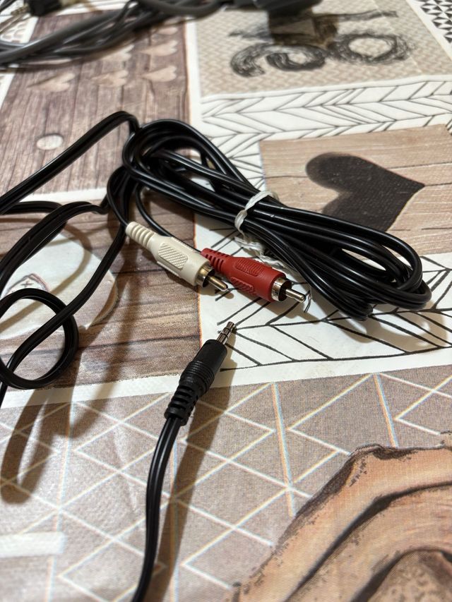 Cavo audio con connettori Jack 3.5mm e RCA. - Un connettore Jack 3.5mm maschio. - Due connettori RCA maschi (uno bianco e uno rosso).