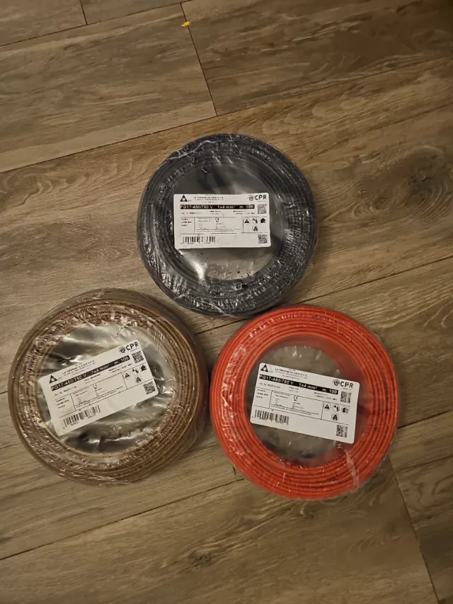 Tre rotoli di cavo elettrico FG17. - Colore nero - Colore marrone - Colore rosso - Tensione nominale 450/750 V - Sezione 1x4 mm² - Lunghezza 100 metri cadauno