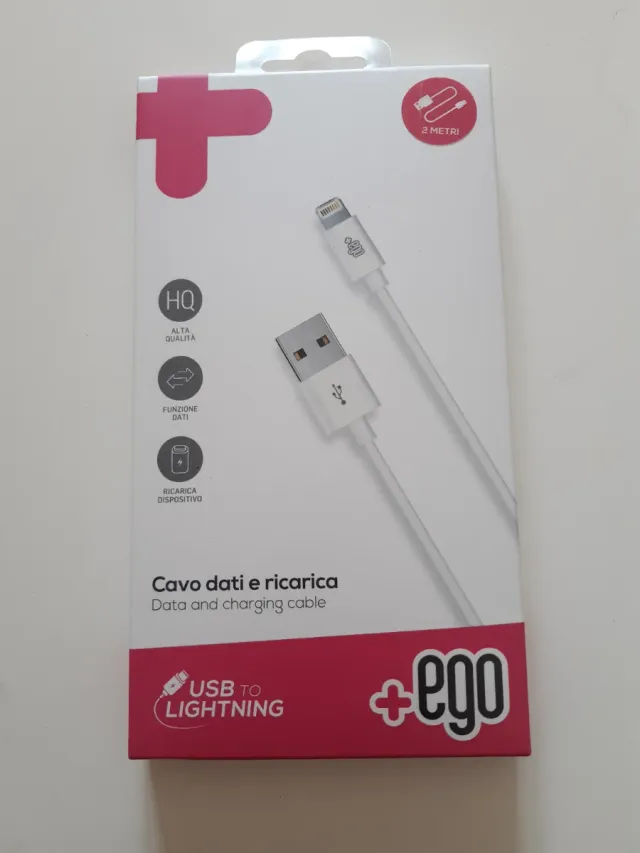 Dettagli del prodottoCavo dati e ricarica USB to Lightning di +ego, lungo 2 metri.