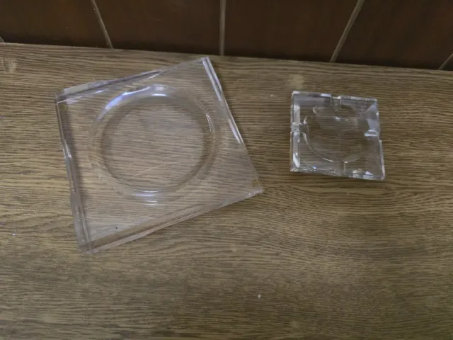 Dettagli del prodottoSet di due posacenere in vetro, uno grande e uno piccolo.