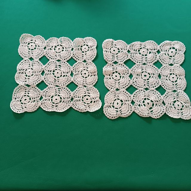 Dettagli del prodottoCoppia di centrini in cotone bianco, fatti a mano ad uncinetto.