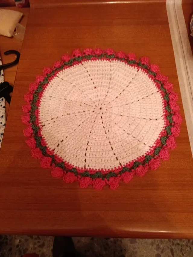 Centrino o sottopiatto realizzato all'uncinetto con un design floreale sul bordo.