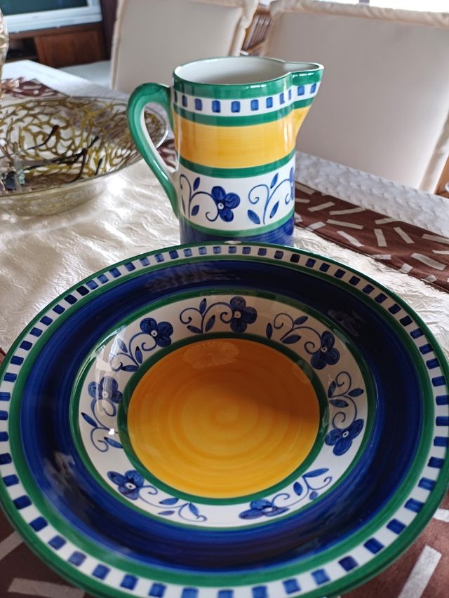 Dettagli del prodottoBellissimo centro tavolo e caraffa in porcellana R B Alcobaca Made in Portogallo. Mai usati, l'unica pecca che si è un po scheggiato il centro tavolo. Misura 33 cm.il centro tavolo, la caraffa 24cm. Di altezza