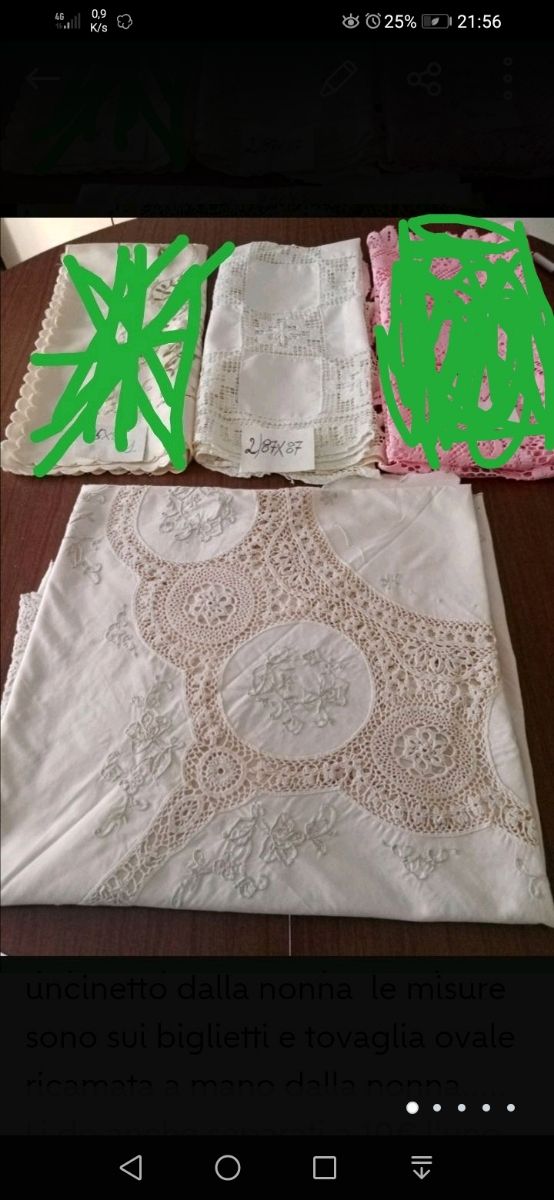 Dettagli del prodotto Centrino lavorati a uncinetto.. le misure sono sui biglietti e tovaglia rotonda ricamata dalla nonna..