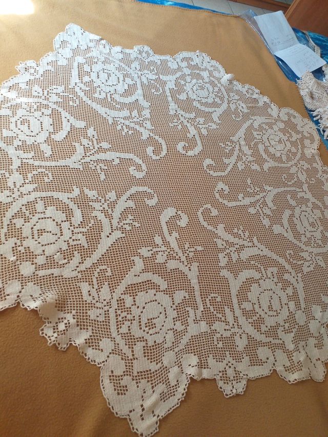 Bellissimo centrotavola realizzato all'uncinetto ,filo di cotone color ecru, 112×112 cm prezzo 130 euro
