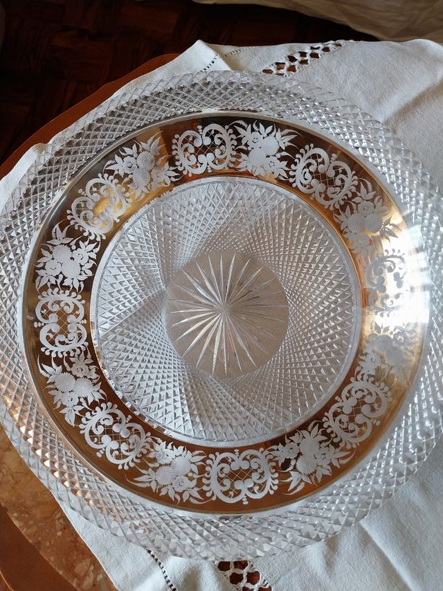 centrotavola in cristallo di Boemia e fascia ignoro zecchino con molitura floreale diametro cm32