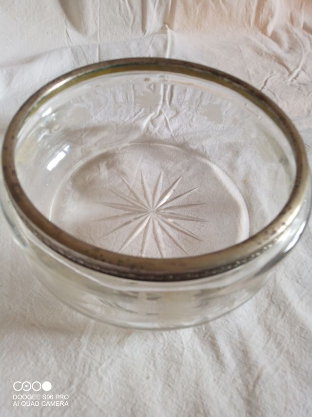 Centrotavola antico primi del '900. In cristallo molato, con bordo in argento 800.