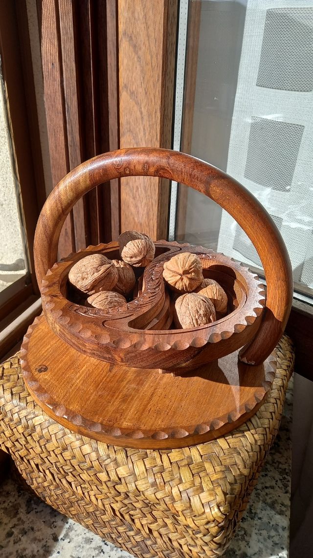 In legno lavorazione artigianale. Ideale come porta frutta secca o caramelle. Piccola imperfezione alla base del manico (foto). Misure in foto.