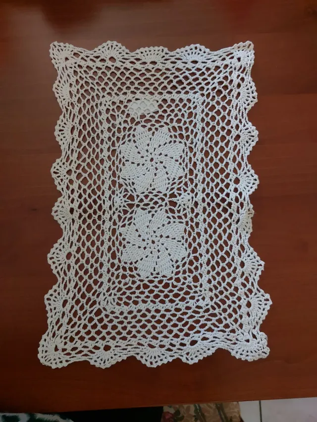 Dettagli del prodottoElegante centrotavola realizzato all'uncinetto, perfetto per aggiungere un tocco di raffinatezza alla tua casa. Il design presenta motivi floreali e un bordo decorato.
