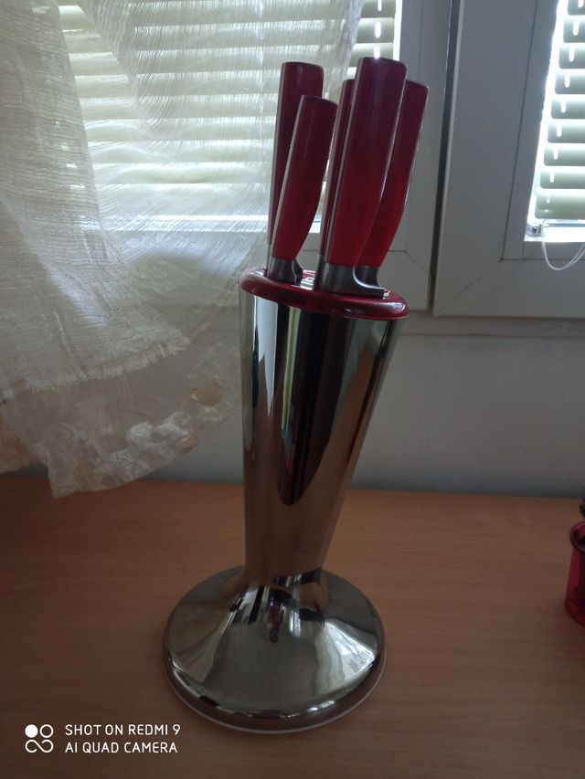 Dettagli del prodottoVendo ceppo GUZZINI rosso con 5 coltelli in acciaio inox con manici ergonomici.