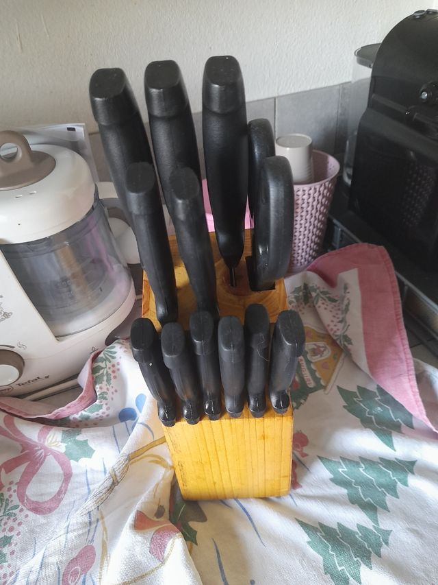 ceppo in legno completo 6 coltelli bistecca 4 coltelli vari 1 forbice 1 forchettone