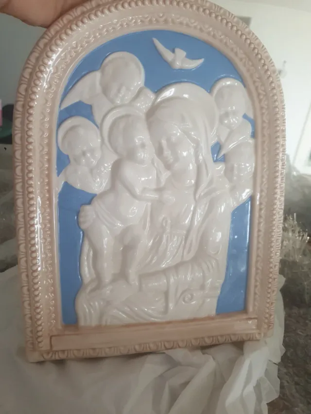 Dettagli del prodottoBellissimo quadro in ceramica artistica originale manifattura italiana DeRuta, raffigurante la Madonna con Bambino e angeli, con cornice decorata.