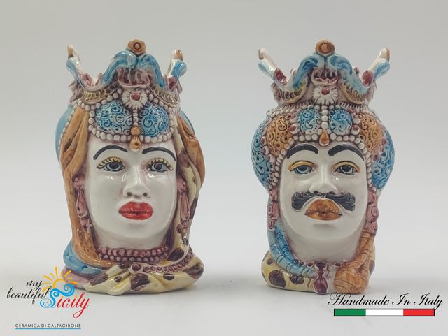 Dettagli del prodottoCoppia di Teste di Moro in ceramica di Caltagirone, realizzate secondo la tradizione e decorate rigorosamente a mano. Modelli dallo stile inconfondibile, dal classico al moderno, con colori e figure tipiche della Sicilia.