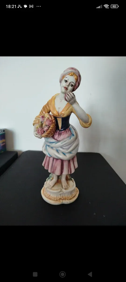 Dettagli del prodottoStatua in ceramica di una contadina con un cesto di frutta, realizzata da Ponte Bassano.