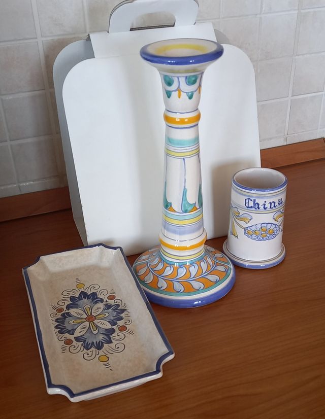 Dettagli del prodottoSet composto da candelabro h. 28 cm, portamatite h. 11, e vassoietto 24x12, delle rinomate ceramiche Deruta, Italia. Solo il portamatite ha una piccolissima lesione sul bordo interno, come da foto, per il resto il set è perfetto. Chiedo esattamente 20, 8 e 10 euro, oppure in blocco a 35. Contattatemi pure senza impegno per pianificare scelta e peso.