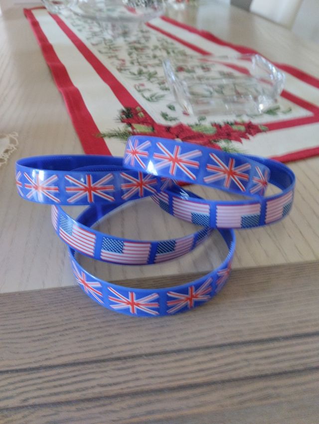 Simpatici cerchietti con bandiera inglese e americana. Sono cinque in tutto.Se interessati ad altri articoli, posso fare set per risparmiare sulla spedizione.