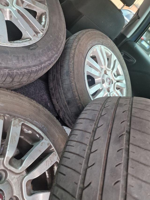 Dettagli del prodotto 4 cerchi in lega da 15 pollici per Fiat, completi di pneumatici Bridgestone. Sono usati, ma in buone condizioni generali, presentano qualche segno di usura dovuto al normale utilizzo.