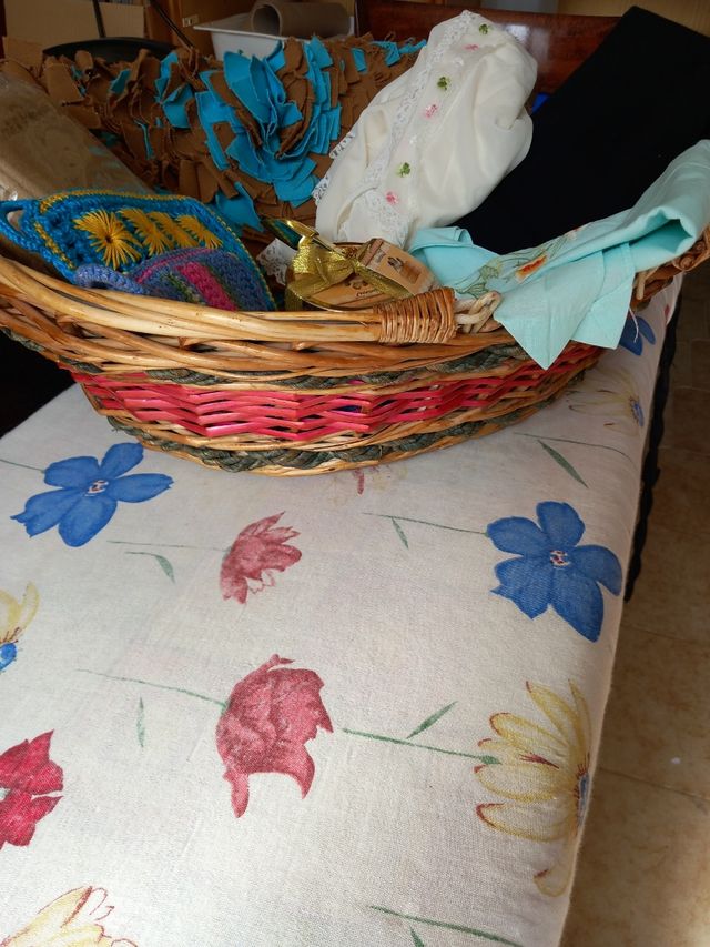 cesta con presine, sciarpa, tappeto, 2grmbiuli nero,grembiulino e una confezione regalo.