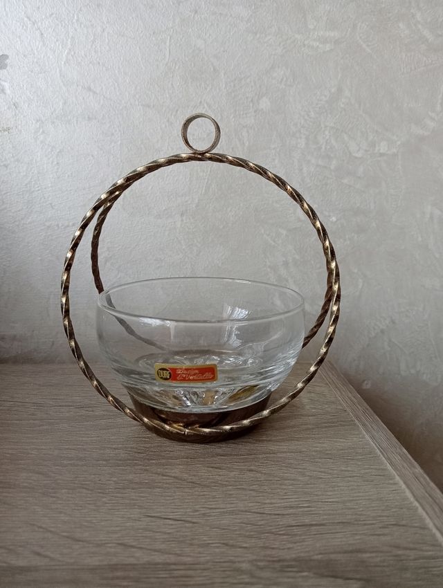 Dettagli del prodottoCestino con coppa in vetro. Porta caramelle o dolcetti o altro. Ottime condizioni, ancora con adesivo originale che indica designer e studio di produzione. P. Vertullo per DURF. Circa anni 70/80. Made in Italy.