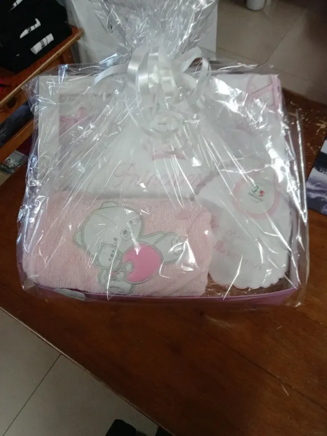 Dettagli del prodottoCesto regalo per la nascita, completo e confezionato.