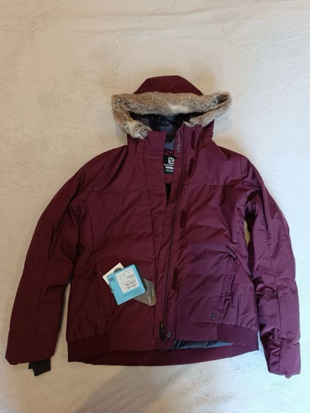 Dettagli del prodottoGiacca da sci SALOMON Snuggly Warm Jkt W in colore bordeaux, con cappuccio e dettagli in pelliccia sintetica. Due tasche interne. Regolazione del colletto, cappuccio, polsini e chiusura interna in vita. Caldo e confortevole Monouso. Impeccabile