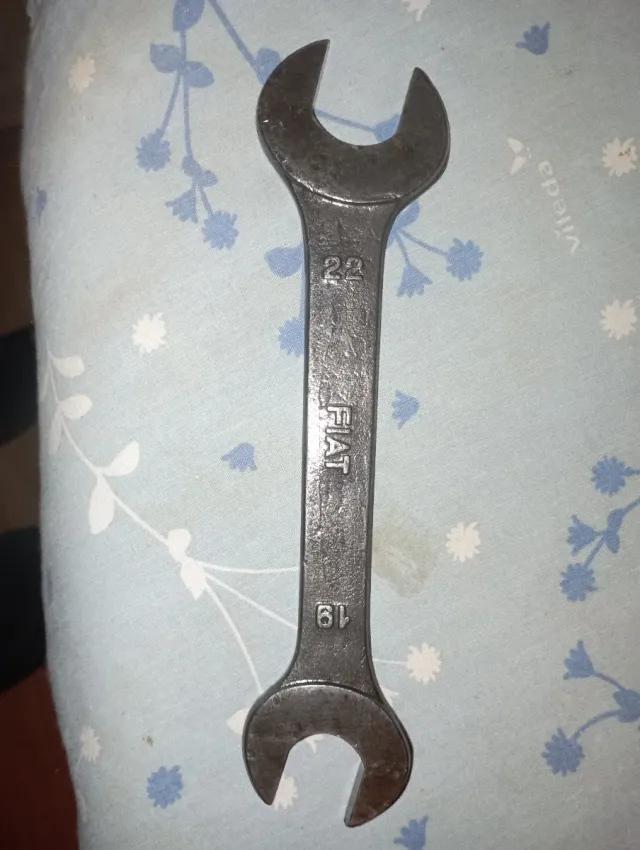 Chiave inglese doppia Fiat, con misure 19 e 22. - Marca: Fiat - Misure: 19 mm e 22 mm È stata pulita e verniciata con una patina trasparente anti ruggine.