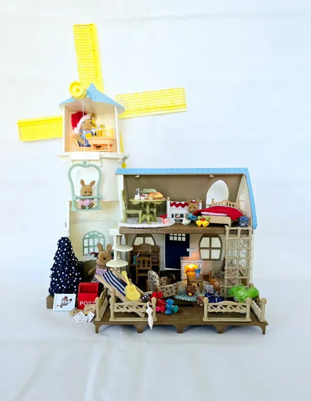 Sylvanian Families codice 5630 mai utilizzato. Completa di tutti gli accessori dettagli che vedi. Il lotto include anche la famiglia dei coniglietti. Le pale del mulino girano veramente e permettono di regolare l'altezza dell'altalena, i bambini lo adoreranno. Il camino si illumina davvero. Il pavimento all'ingresso si può spostare dietro o davanti. L'albero, i tappeti, i tessili e la pianta sono pezzi unici creati