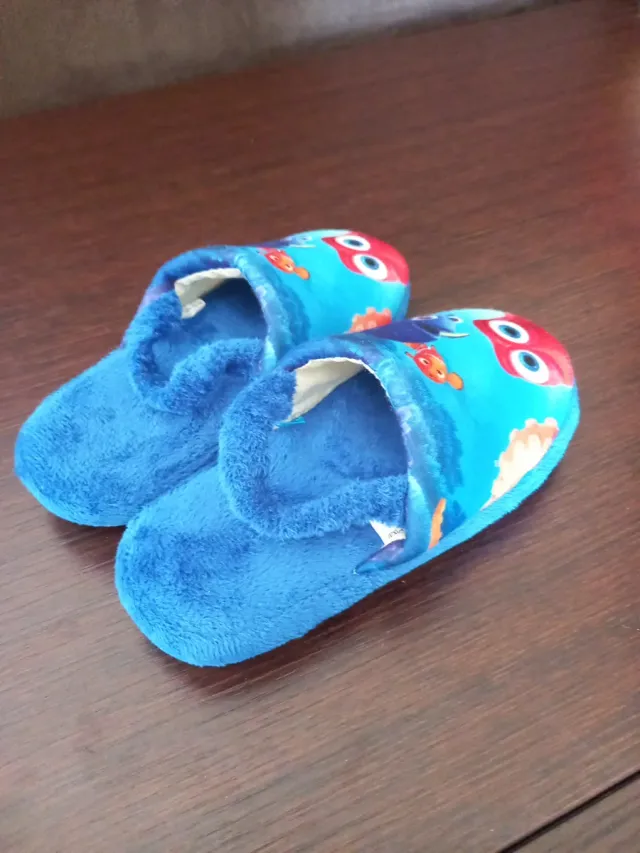 Comode ciabatte per bambini con una divertente stampa di personaggi. - Colore blu vivace. - Materiale morbido e caldo. - Design a pantofola.