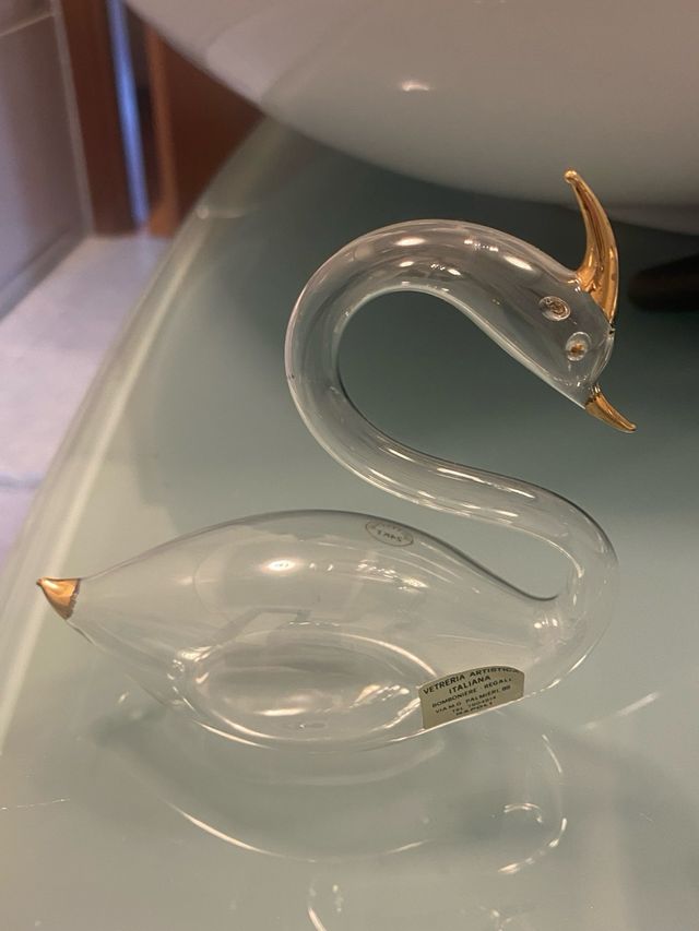 soprammobile della Vetreia artistica italiana a forma di cigno in vetro soffiato con particolari in oro zecchino 24k. Molto fine. Altezza 11 cm, larghezza 12 cm