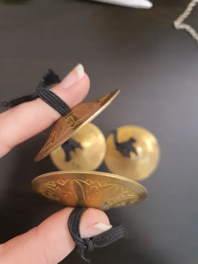 Dettagli del prodottoPiccoli cimbali in metallo dorato, decorati con motivi floreali e animali.