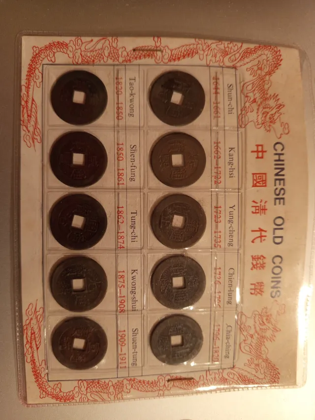 Dettagli del prodottoSet di vecchie monete cinesi, Chinese Old Coins. Ogni moneta è presentata in una sezione dedicata con il nome del periodo e gli anni di riferimento.